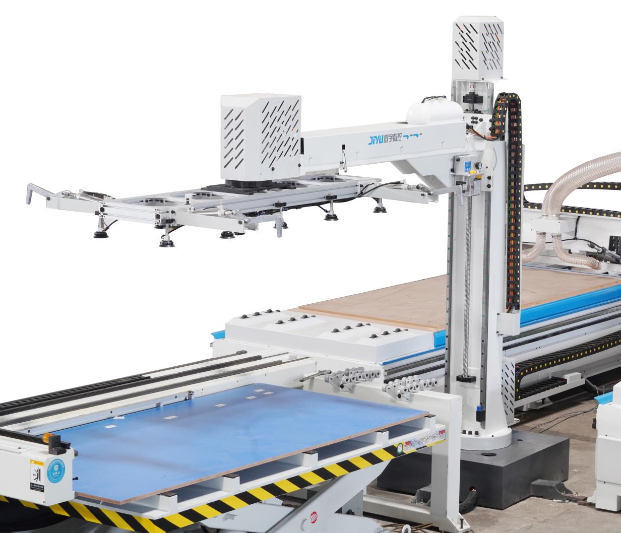 Предназначен для перемещения листов плитного материала от загрузочного стола и загрузки их на два фрезерных станка с ЧПУ.
