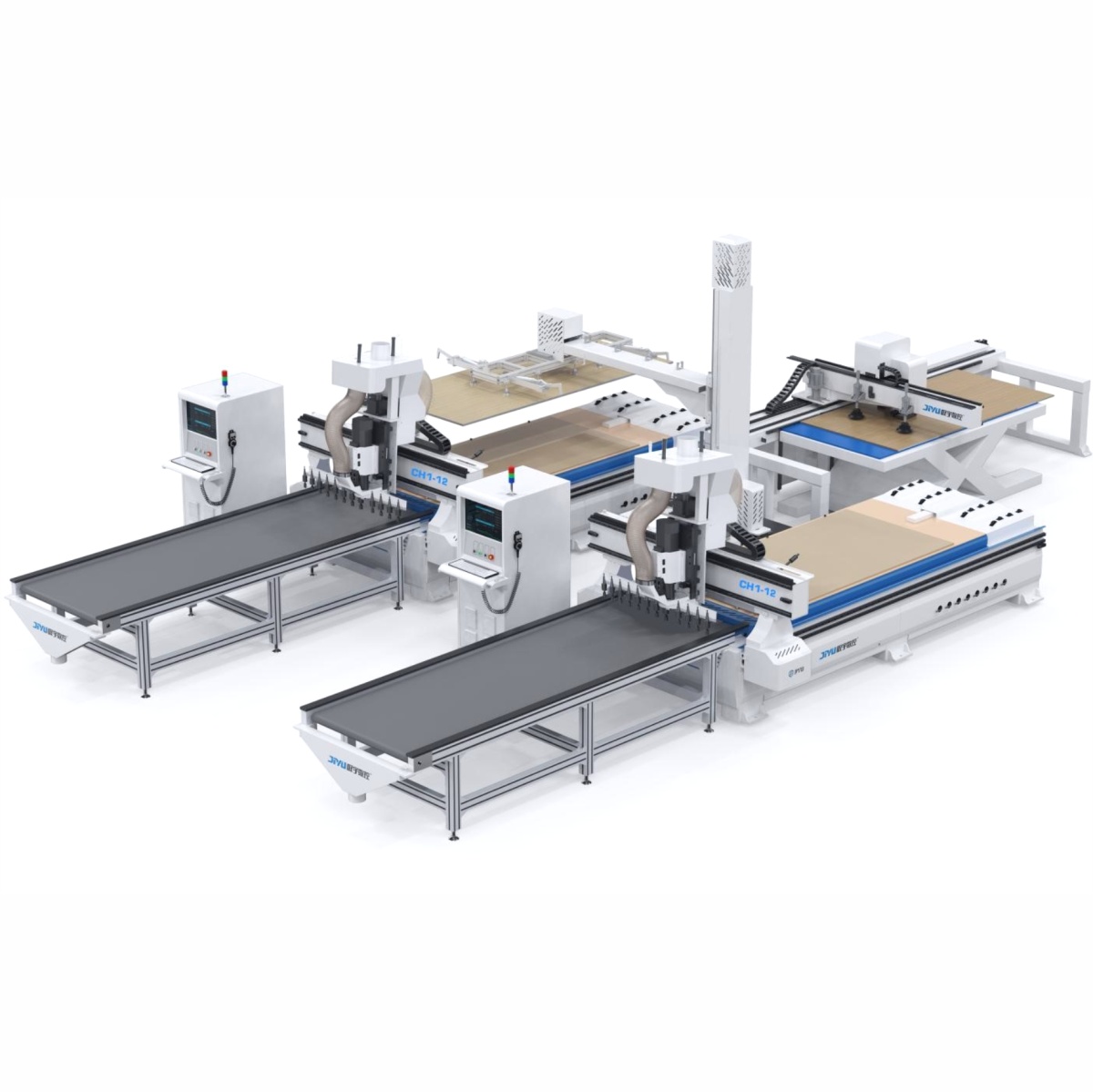Автоматическая линия с автоматической печатью этикетки и роботизированной загрузкой материала на 2 обрабатывающих центра, предназначена для скоростной фрезерной обработки и плоскостной присадки плитных материалов в автоматическом режиме. Популярное и востребованное решение для изготовления корпусной мебели по технологии NESTING. Эффективно используется в серийных производствах мебельных деталей. Может использоваться как отдельно, так и быть внедрена в систему замкнутого автоматического цикла.