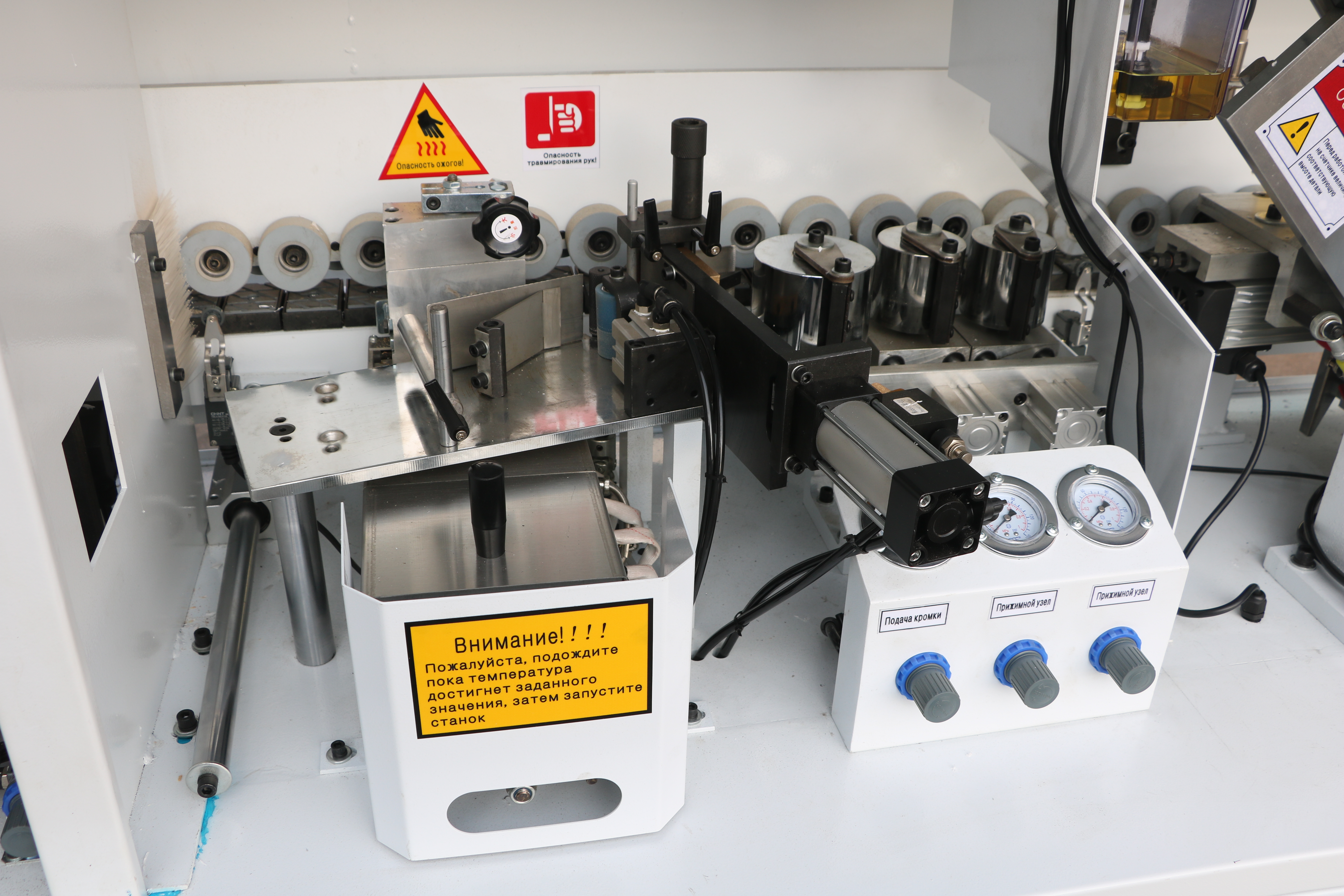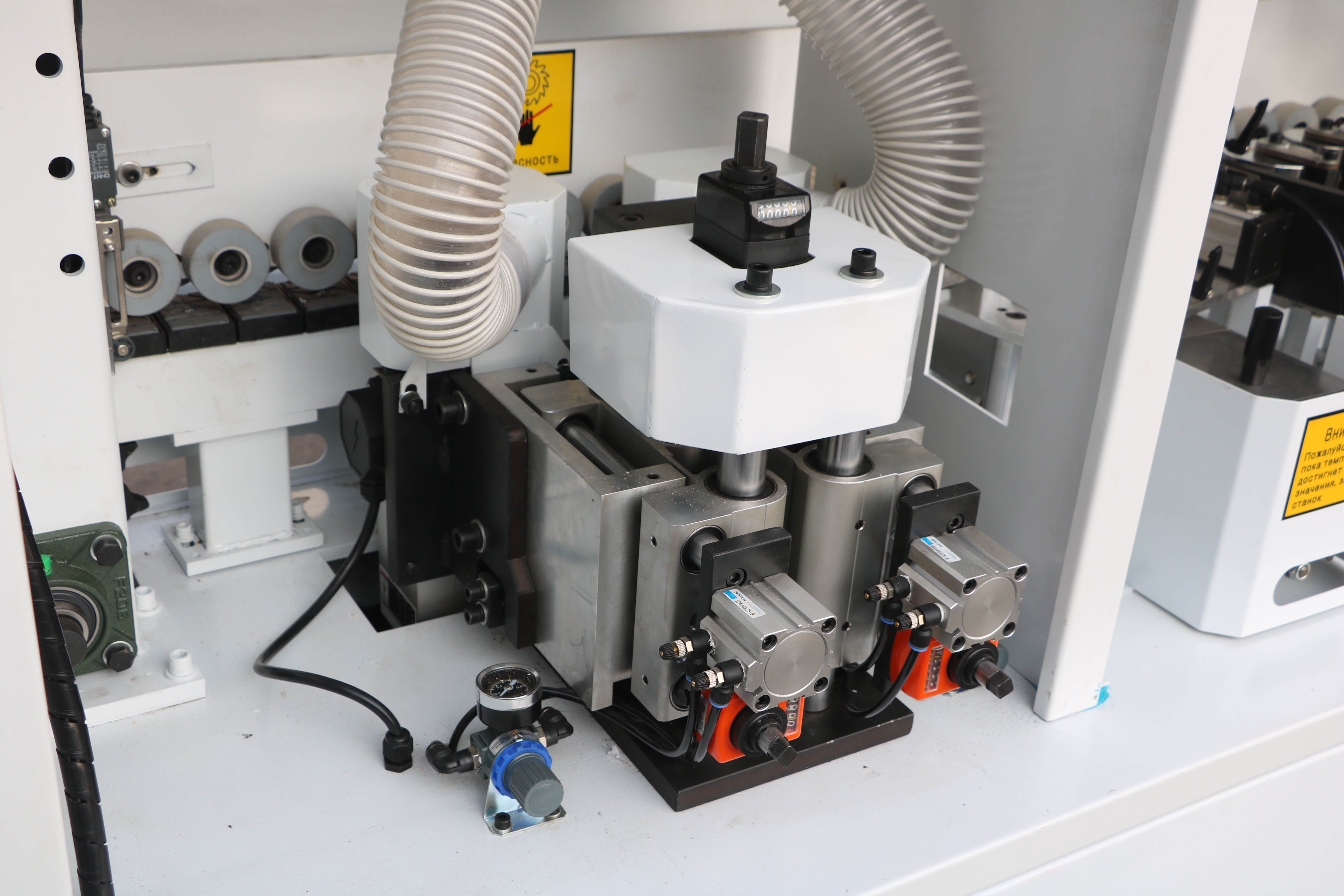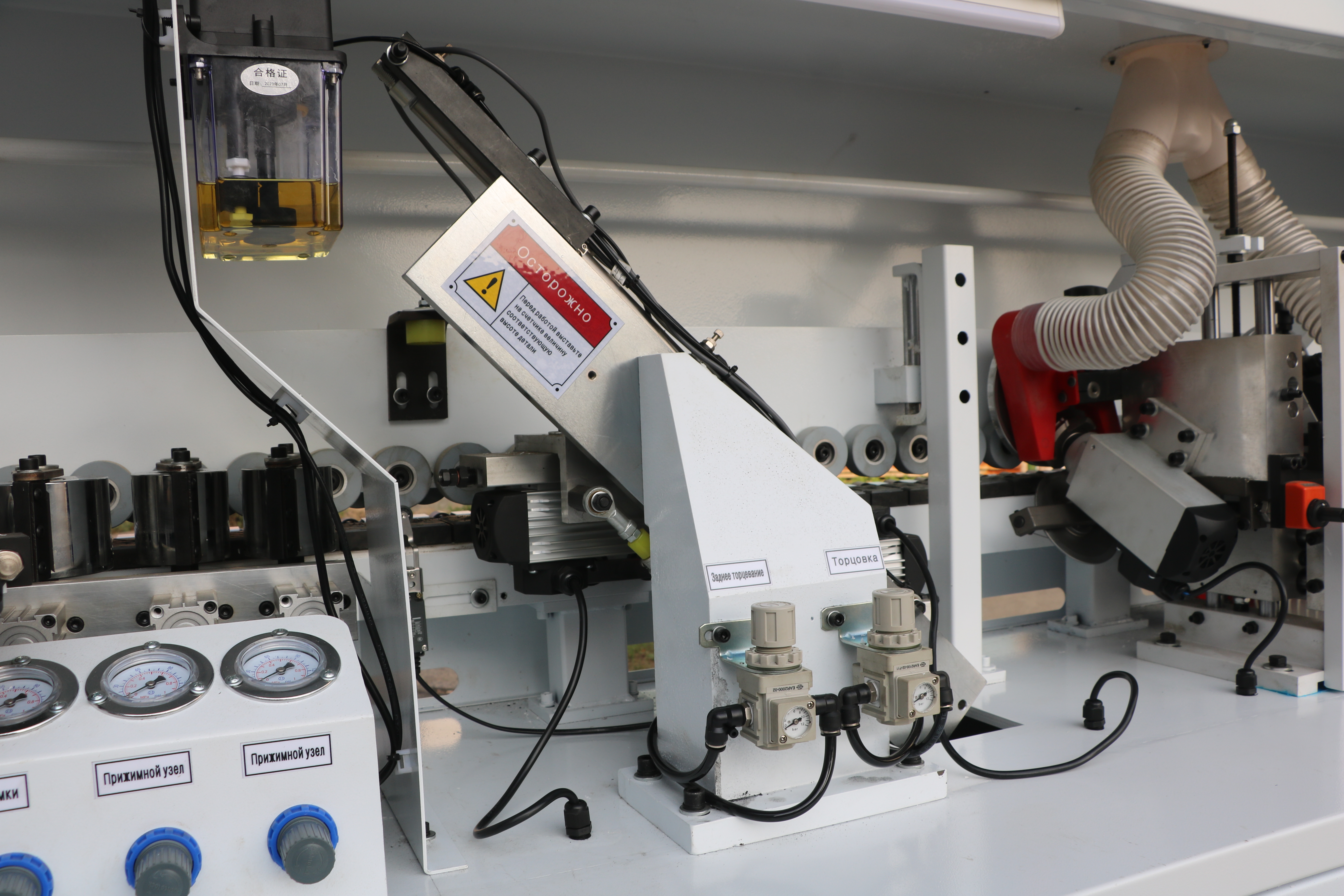 Прижимной блок с пневматическим управлением оснащен одним основным и одним полноценным допрессовочным роликом, давление на ролики может регулироваться в зависимости от типа используемой кромки и деталей.