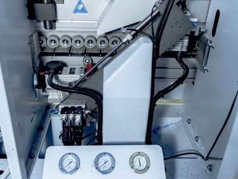 Клеевая ванна с нижним расположением, не требует перенастройки на толщину материала, обеспечивает безупречное нанесение клея-расплава на торец обрабатываемой детали.