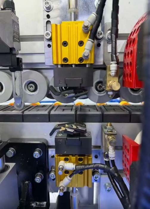 Торцовочный узел с двумя высокочастотными моторами: Оснащен высоко оборотистыми двигателями 12000 об/мин. Совершая движение по линейным направляющим, обеспечивает точное торцевание в размер пильными дисками D-100 мм.