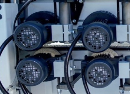 Узел закругления углов кромки (раундер) оснащен 4 мя высокооборотистыми двигателями мощностью по 0,35 кВт. Работает с деталями высотой от 10 до 60 мм).