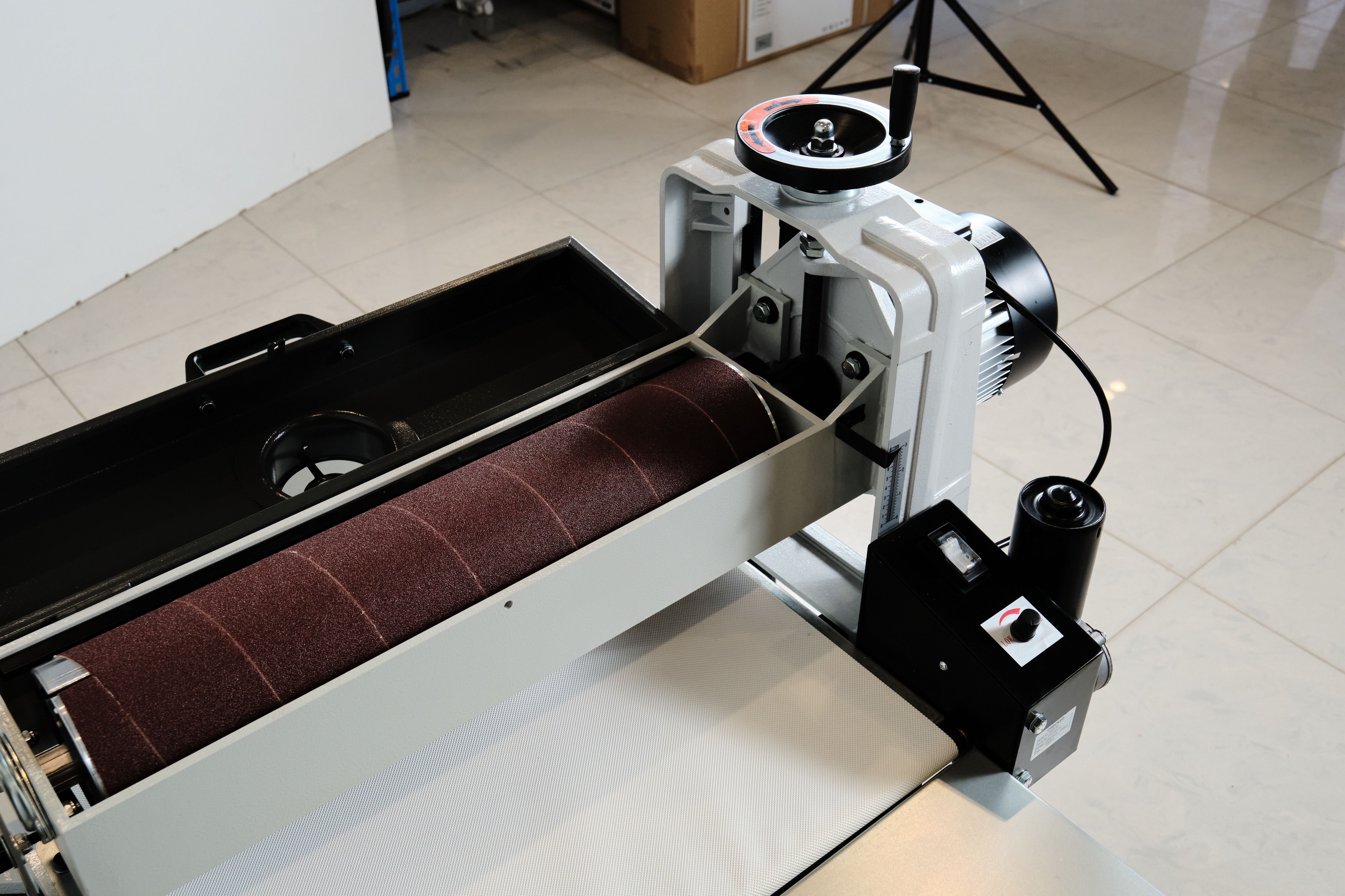 • Шлифовальный барабан имеет консольное расположение. При необходимости обработки более широких заготовок можно снять левую стойку и в два прохода обрабатывать детали шириной до 1110 мм.