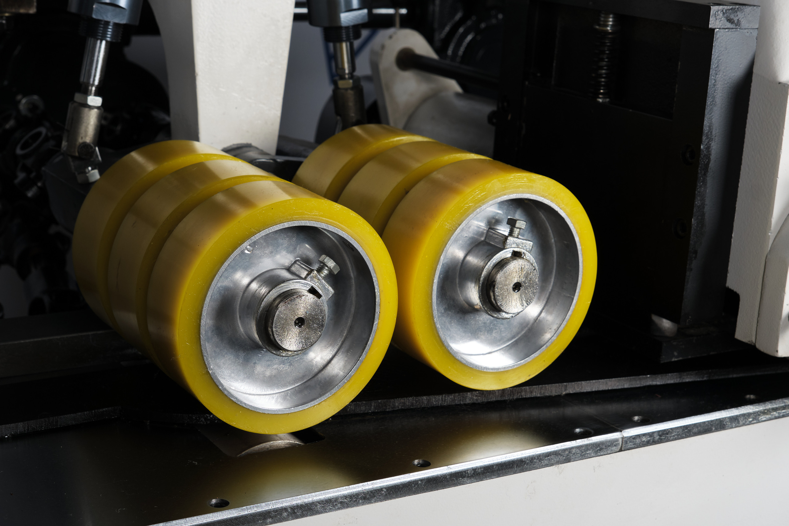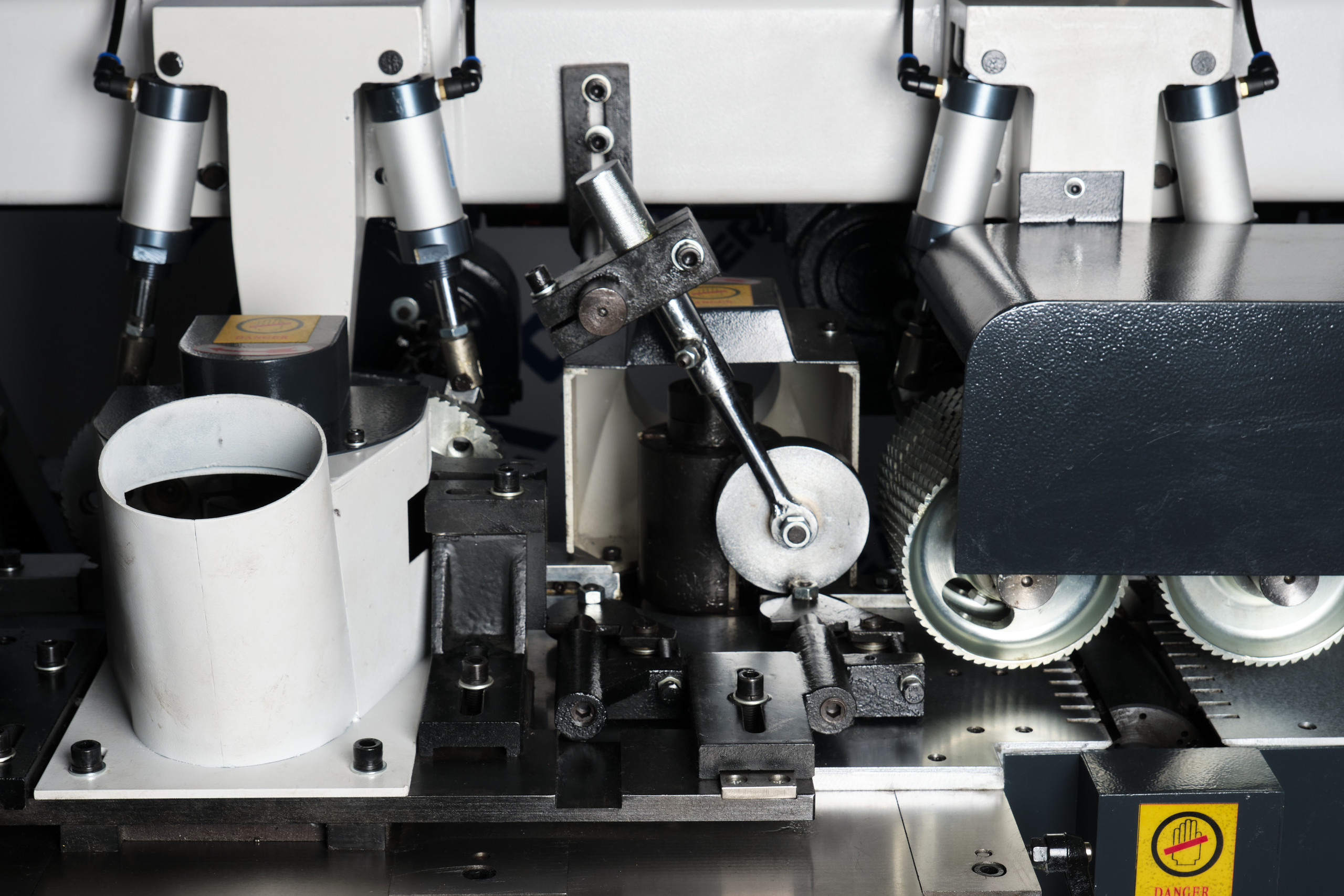Пневматическое подающий ролик имеет возможность регулировать усилие, что способствует плавной подаче заготовок, различной толщины