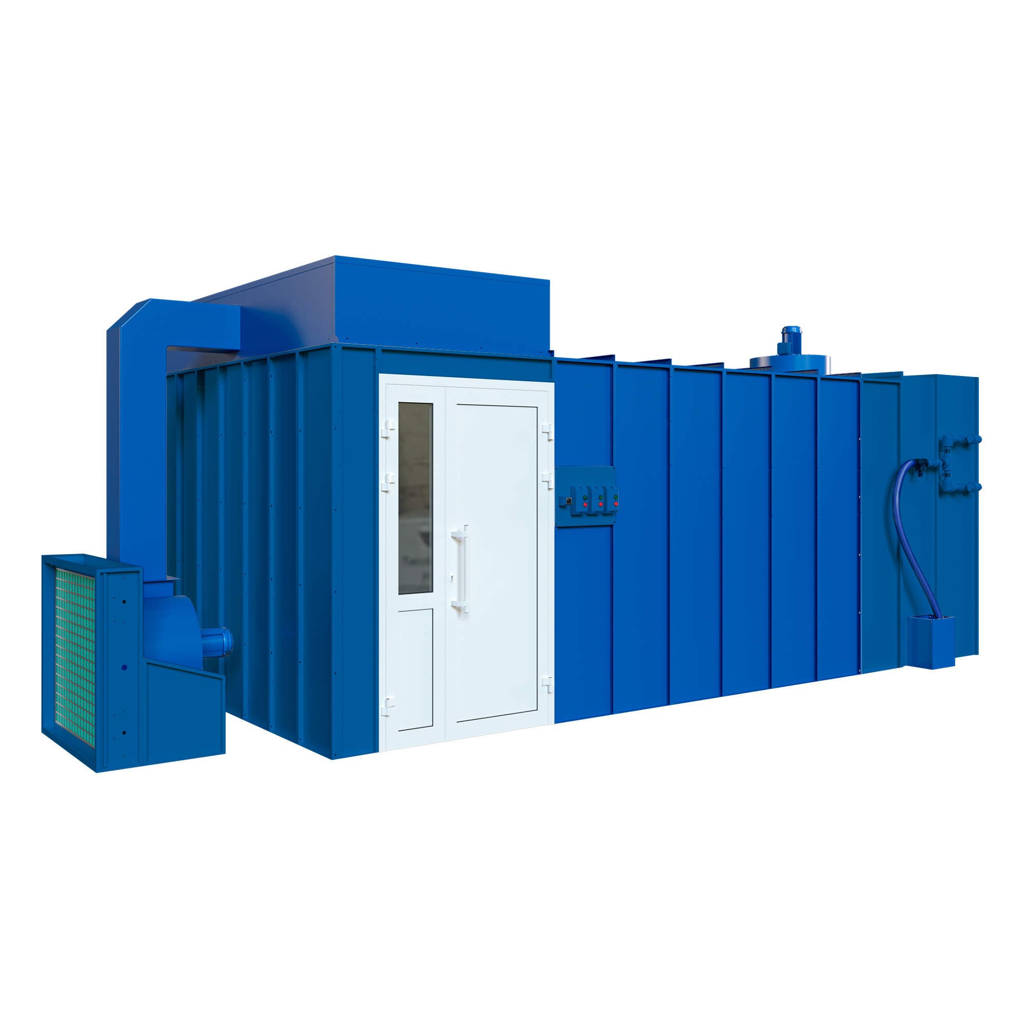 Покрасочная камера представляет собой кабину (комнату) с водяной завесой, активным водяным полом и потолочным фильтром приточной вентиляции, оборудованным фильтром. Последний обеспечивает грубую очистку воздушного потока, подаваемого в приточную зону.