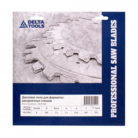 Дисковая пила DELTA TOOLS 200x3,2/2,2x25,4 Z=64 трапеция для ФРС предназначена для пиления биламинированных панелей с меламиновыми покрытием и не облицованных плит ДСП, MDF на форматно-раскроечных станках с использованием подрезной пилы.