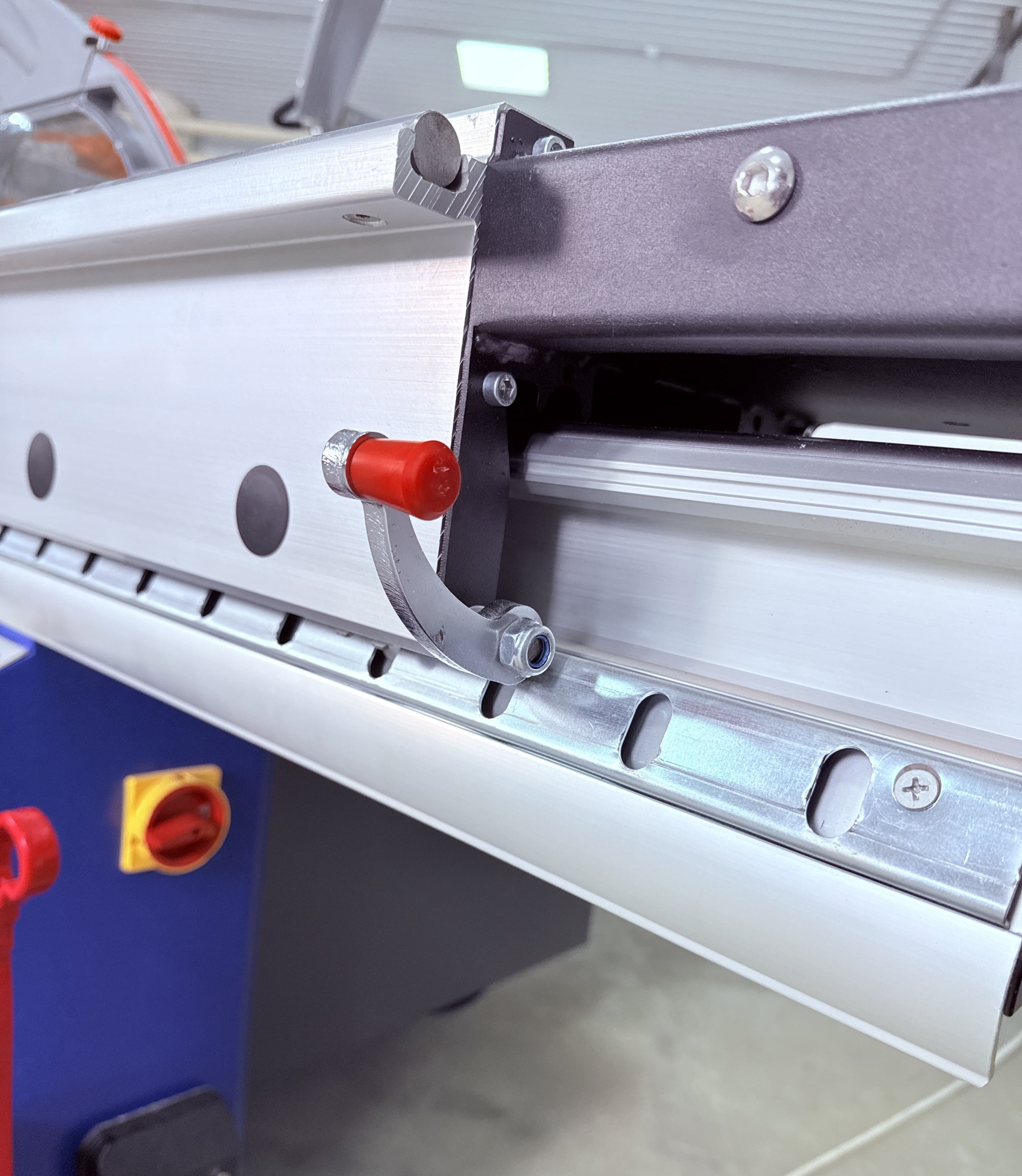Опорный стол можно передвигать и быстро фиксировать с помощью мощного зажима. Система настройки и регулировки диагоналей, выполненная с 2-х сторон стола, позволяет применять схему раскроя на мелкие детали «от себя», так, как это выполнено на станках ведущих европейских производителей.