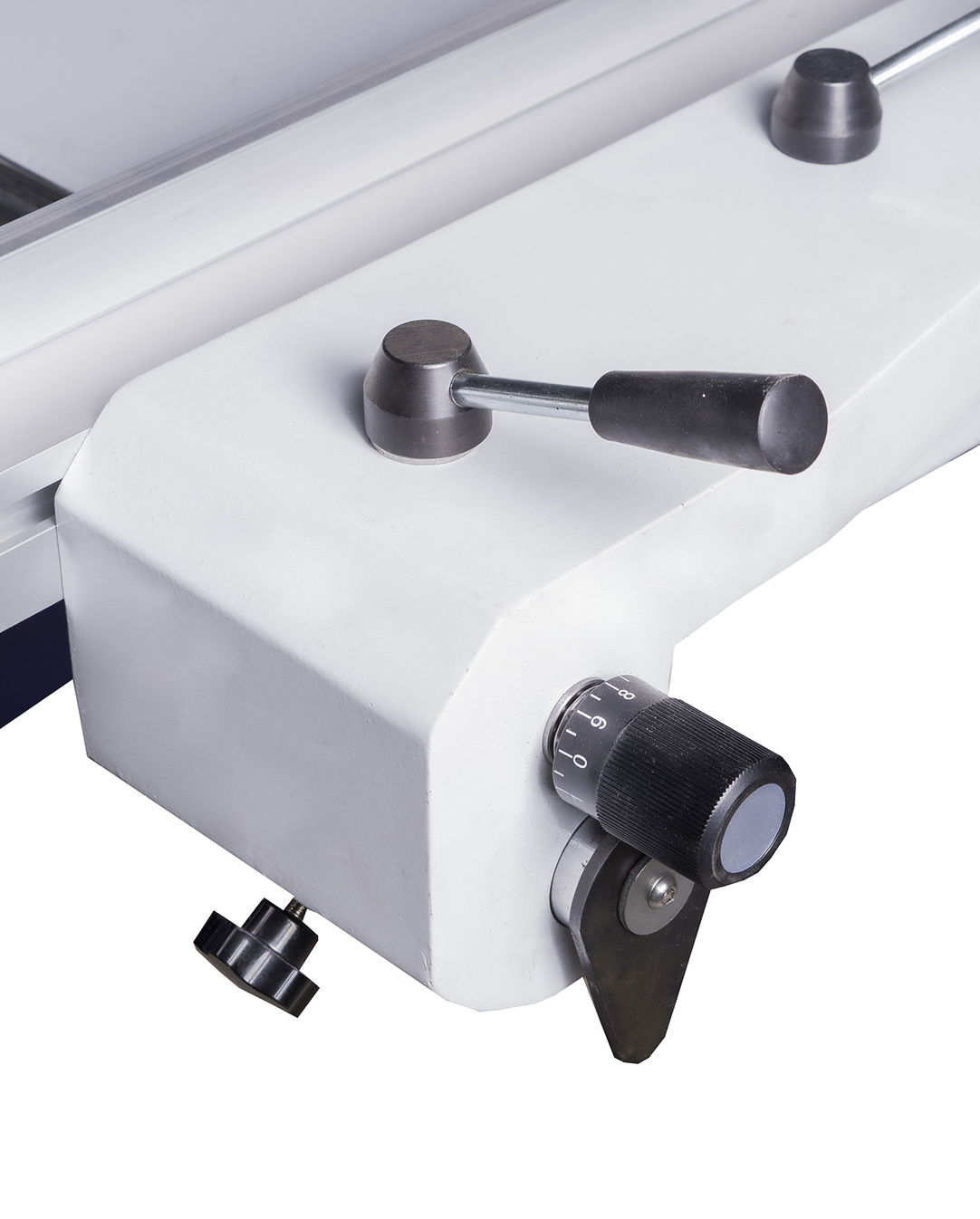 Эргономичный пульт управления обеспечивает удобство управления. Регулятор высоты подъёма пильного диска, электронная визуализация угла наклона пильного диска. Левее расположен маховик регулировки наклона пильного узла на 45°.