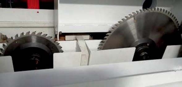 Пильный блок на массивных направляющих оснащен раздельными приводами основного (15кВт) и подрезного (1,5кВт) пильных дисков.