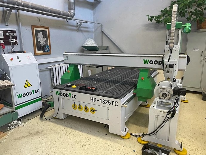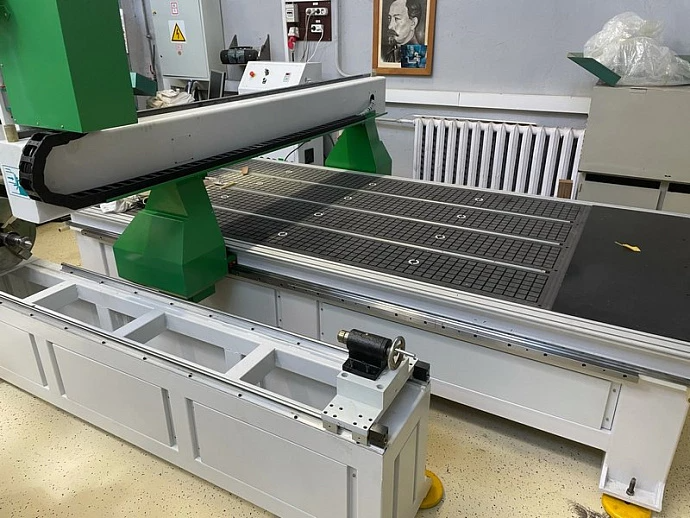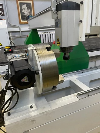 Ось вращения для обработки балясин. Максимальный диаметр заготовки - 300 мм. Длина заготовки максимальная - 1500 мм. Поставляется с трехкулачковым патроном и задней бабкой, перемещающейся по направляющим. Поддерживается полноценная четырехосевая обработка.
