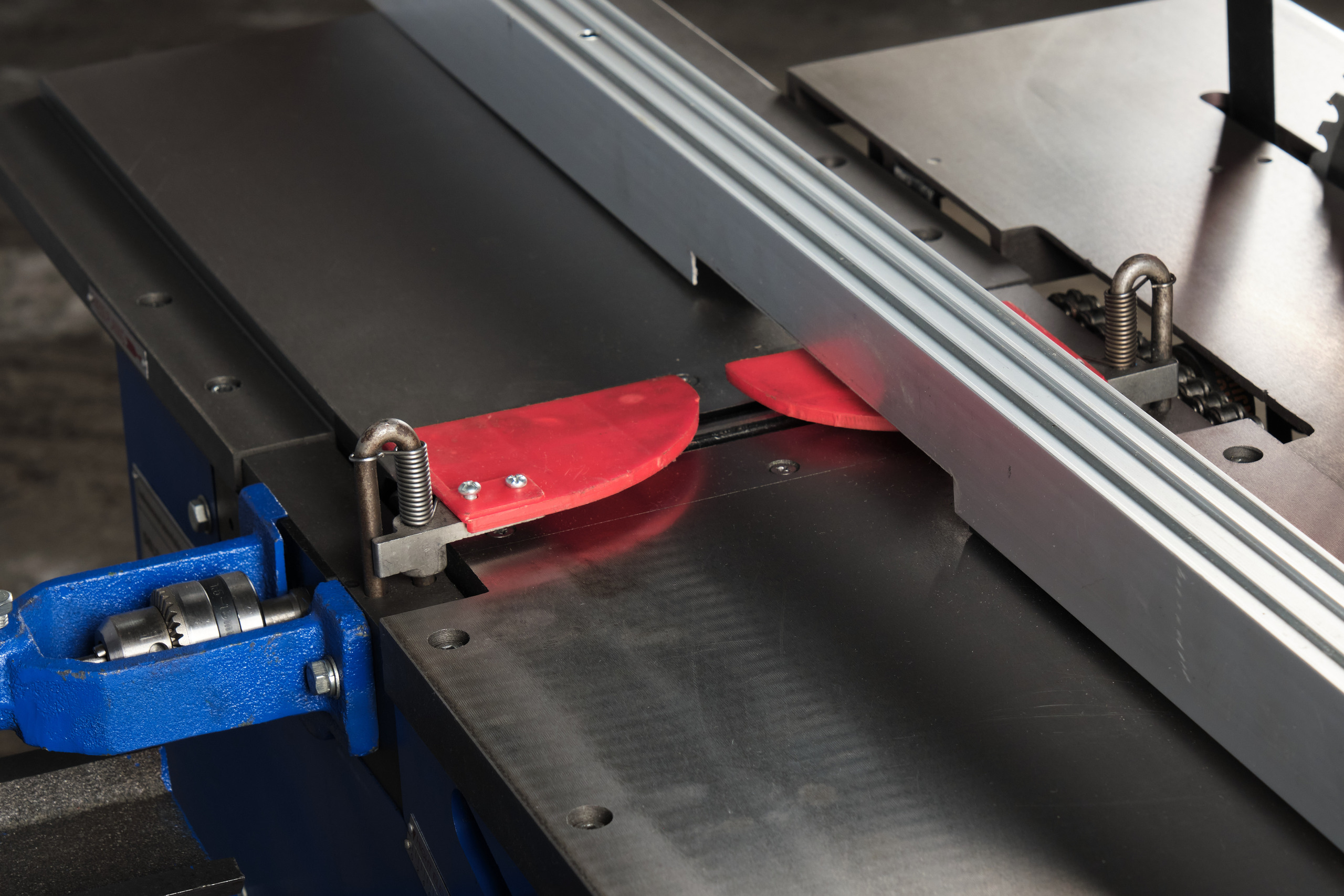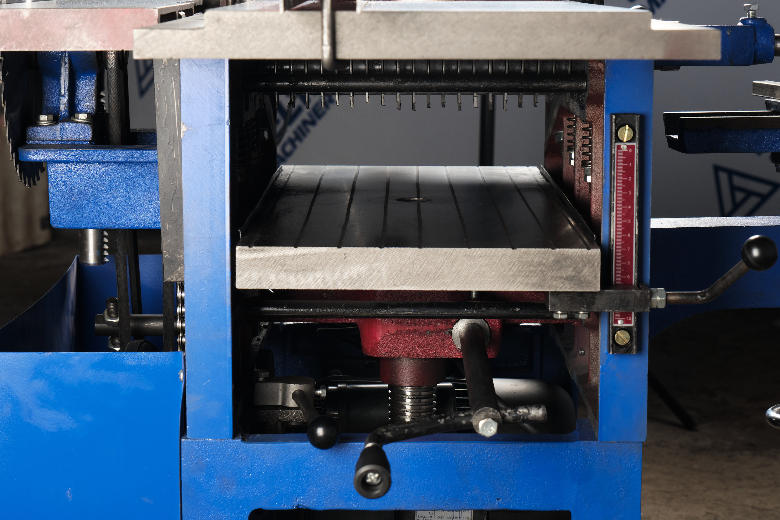 Осуществляется при помощи пары винт-гайка, позволяет настроить стол на необходимую толщину снимаемого слоя при фуговании, дополнительная фиксация двумя винтами, обеспечивает стабильность выставленного размера, даже при работе с твердыми и тяжелыми породами.