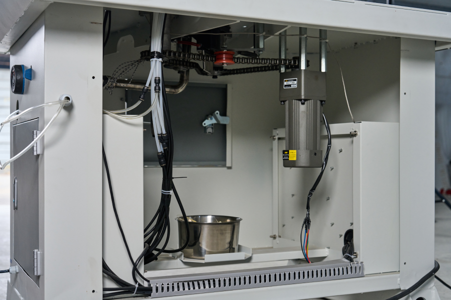 Станок оснащен универсальной клеевой ванной 1200мл позволяющей использовать при работе клей расплав EVA или PUR клей в зависимости от задач. Система подачи очистительной жидкости форсунчатого типа в зону прижима, для исключения налипания лишнего клеевого состава.