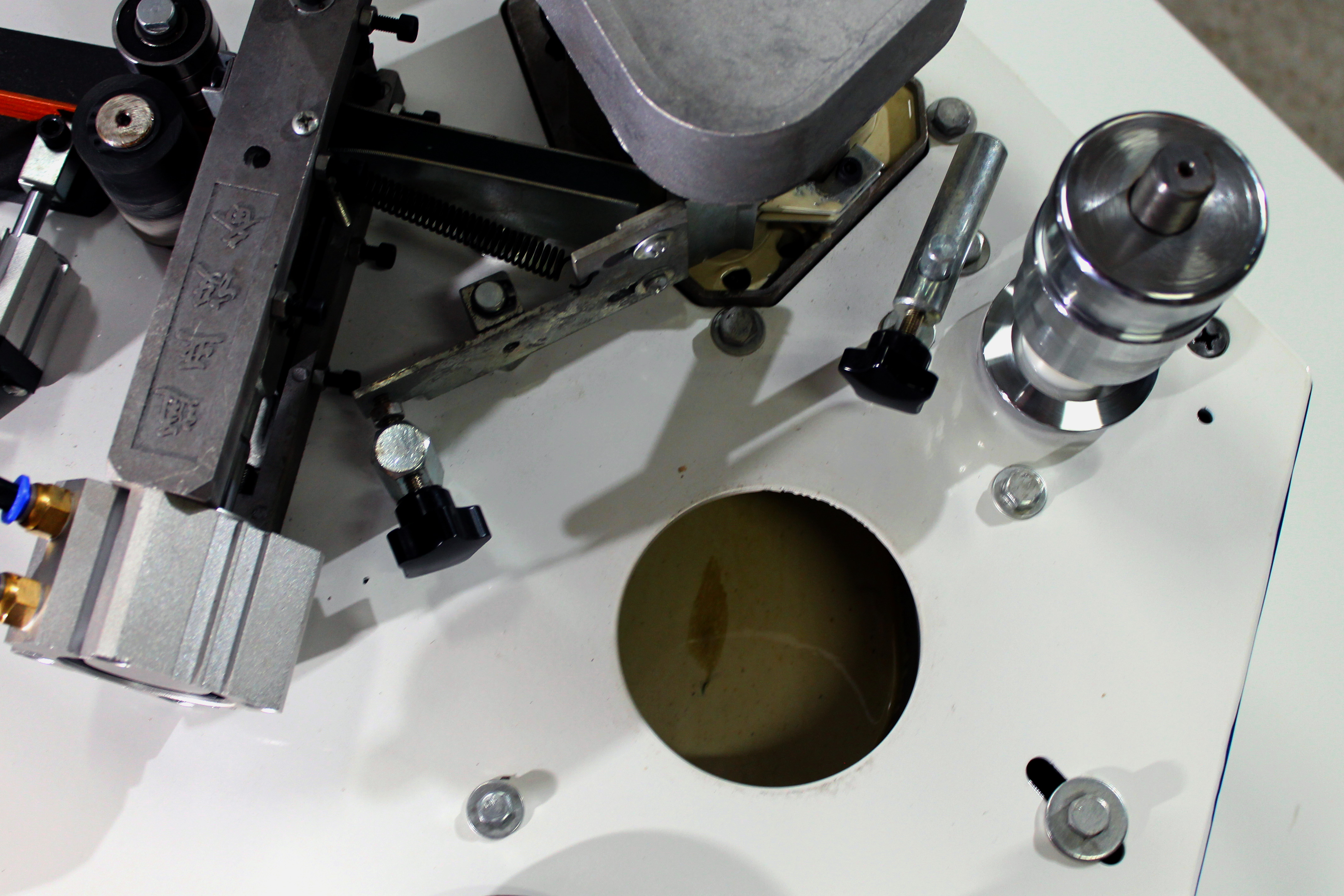 Станок оснащен 2 клеенаносящими роликами, что позволяет наносить клей не только на поверхность кромочного материала, но и на заготовку.