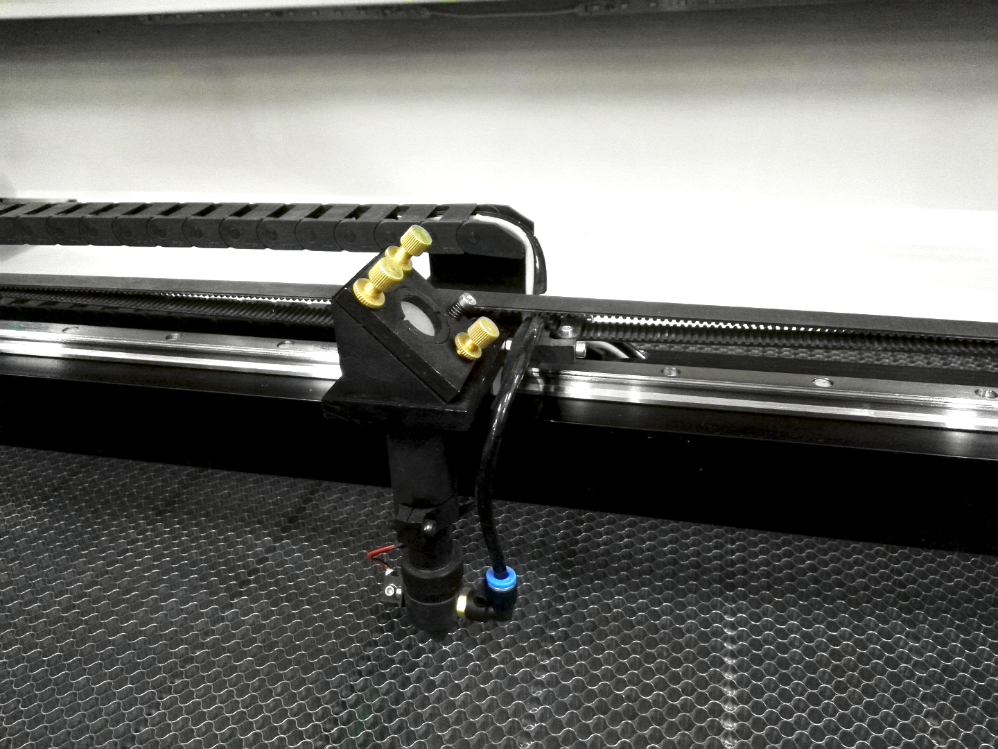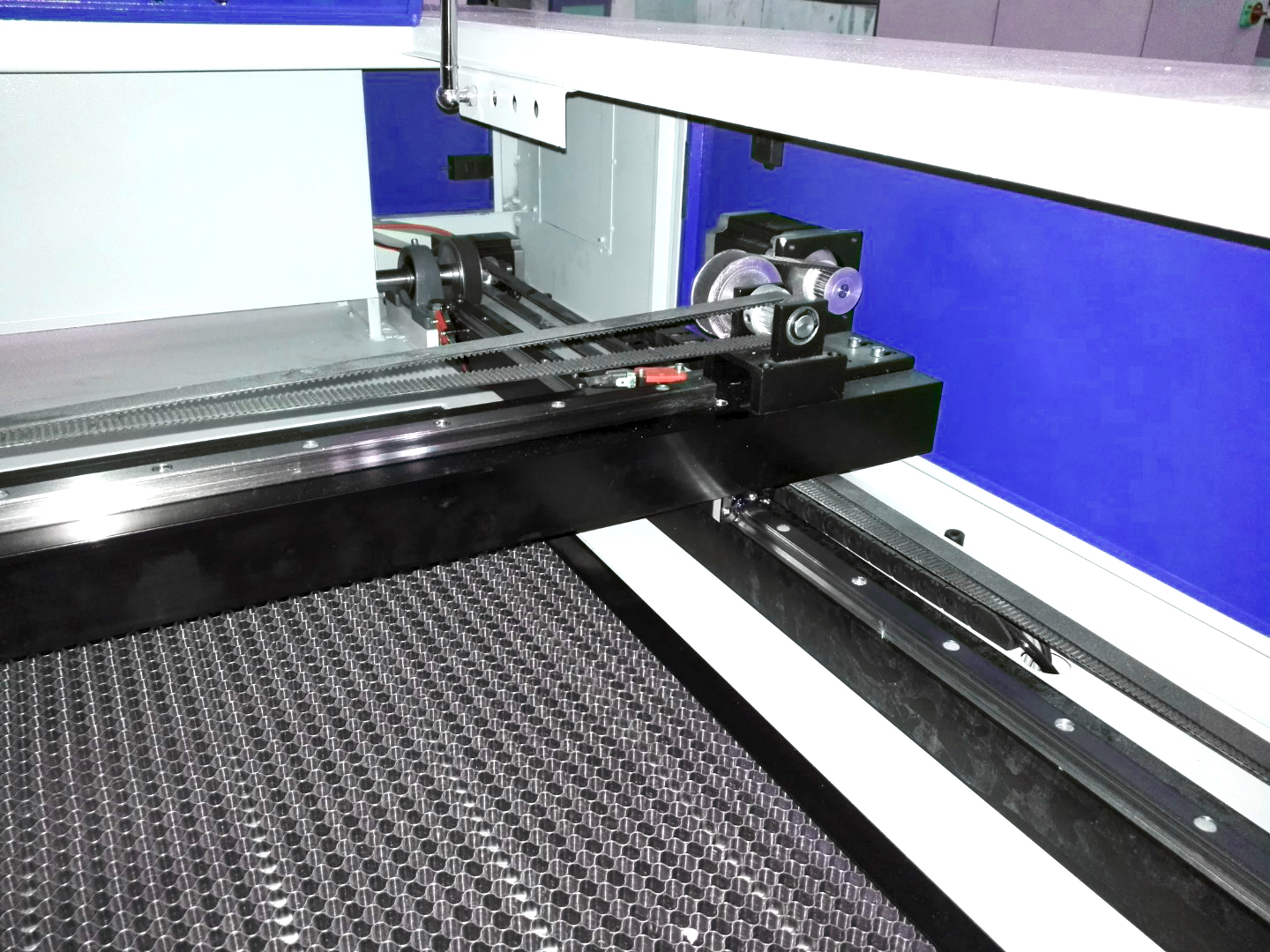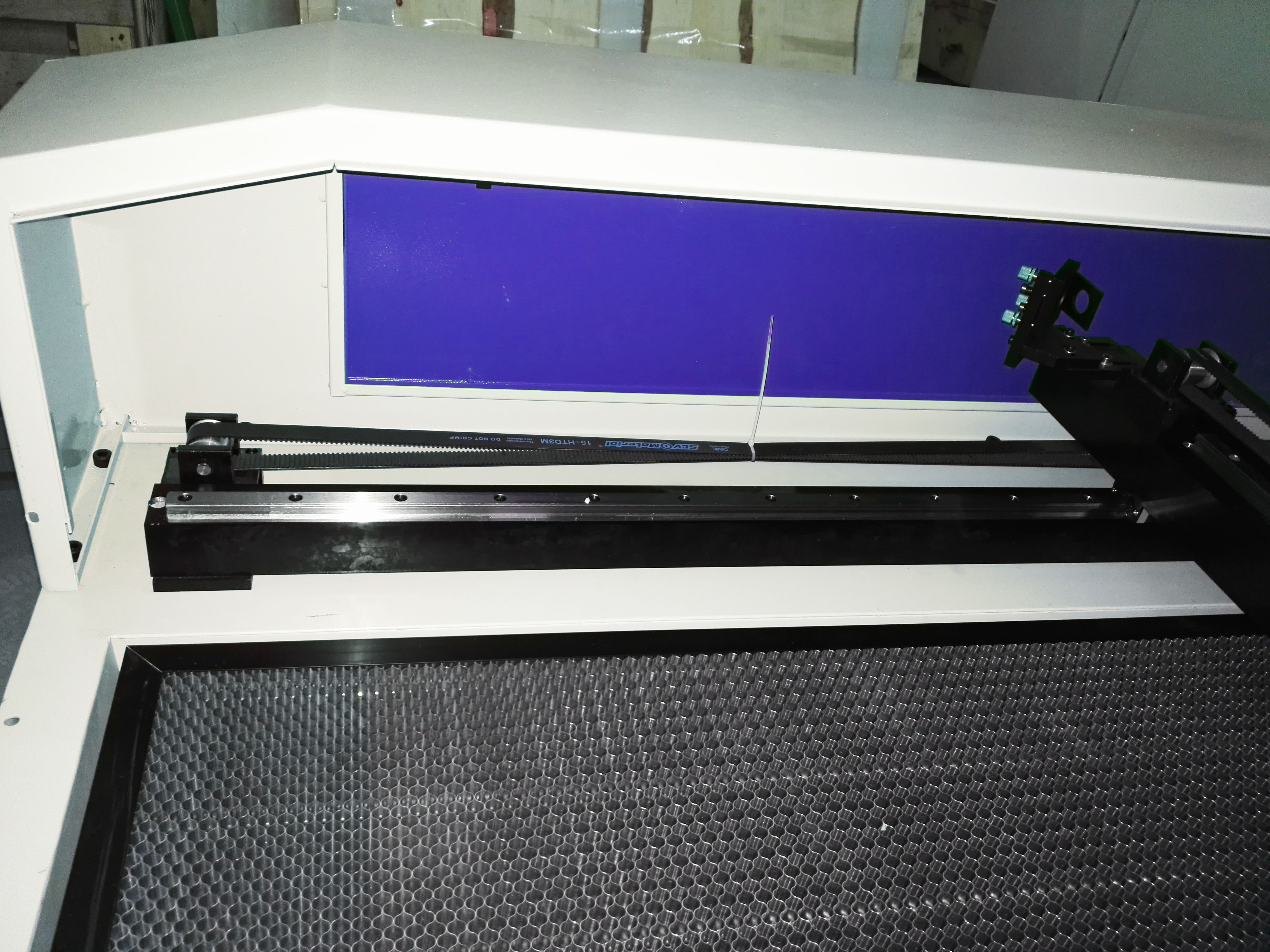 Ячеистый рабочий стол размером 1400х100 мм. Перемещение лазерной головки производится за счет шаговых двигателей посредством ременной передачи.