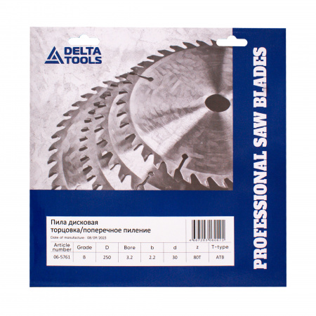 Пила дисковая DELTA TOOLS 250х30х3.2/2.2 Z=80 WZ торцовка/поперечное пиление с твердосплавными напайками предназначена для поперечного распила и торцовки древесины, листов фанеры, оргалита (ДВП).