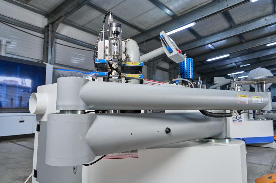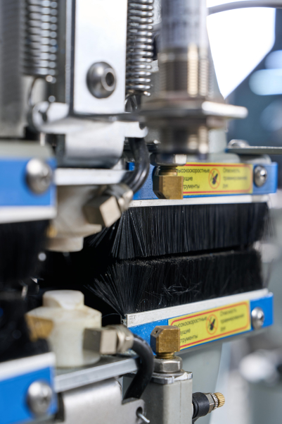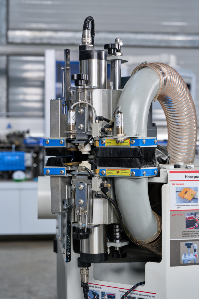 Двухсторонний фрезерный узел для снятия свесов оснащен высокооборотистыми моторами 24 000 об/мин, мощностью 800 Вт каждый. Фрезер оборудован копирами с микронастройкой по плоскости и приводным копиром с изменяемой скоростью подачи по торцу заготовки. В зону обработки нижней и верхней фрезы возможна подача разделительной жидкости с помощью форсунок расположенных на фрезерном узле.