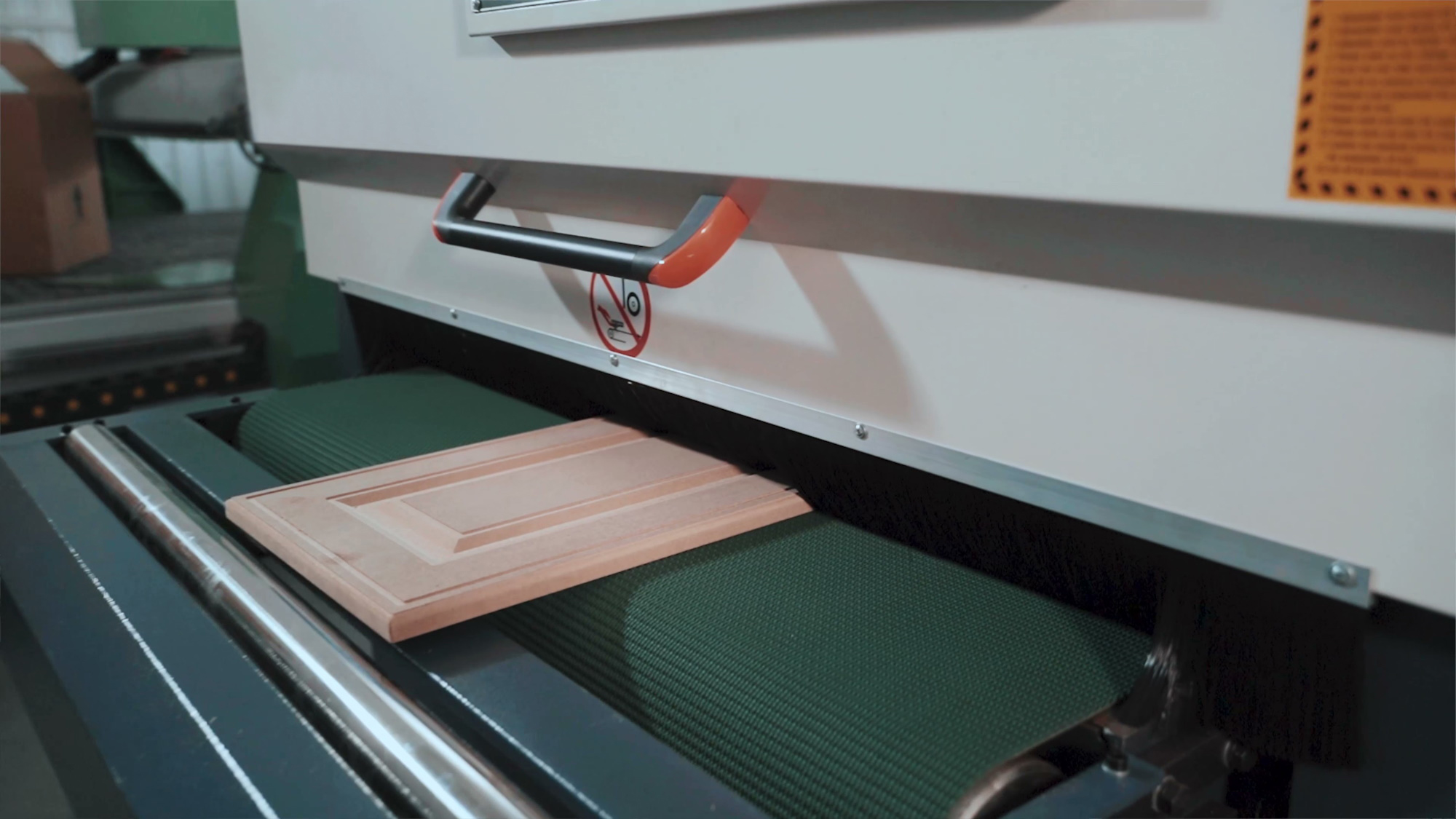 Первым этапом заготовка обрабатывается сдвоенным поперечными шлифовальным блоком, со спирально расположенными на барабанах щетками. Вторым этапом идет обработка сдвоенным блоком чашечных щеток. (Поперечный и чашечный блоки имеют механизм осцилляции) Третьим этапом обработки является Сдвоенный продольный шлифовальный блок (два барабана во всю ширину рабочего стола, с щетками расположенными по спирали)