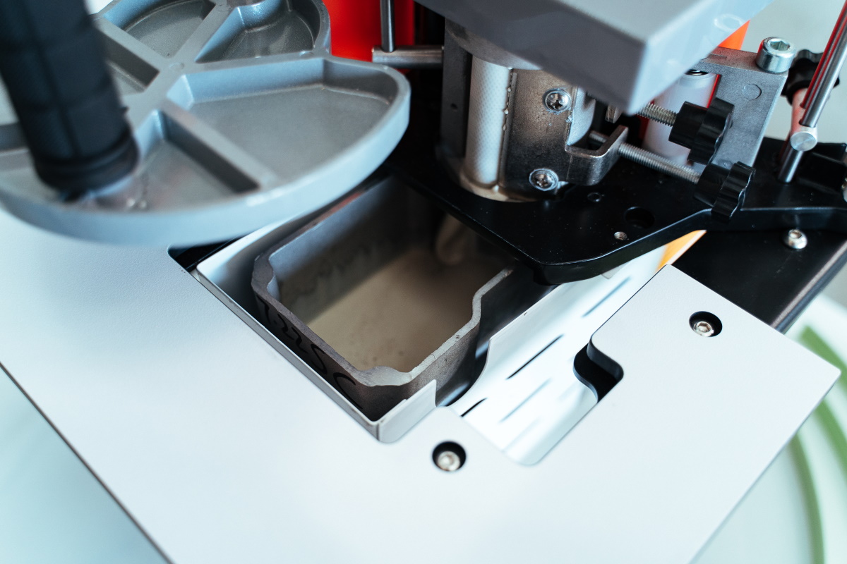 Подача кромочного материала осуществляется автоматически от отдельного электродвигателя. В качестве облицовочного материала используется кромочный материал из ПВХ, АБС, меламина и натурального шпона.