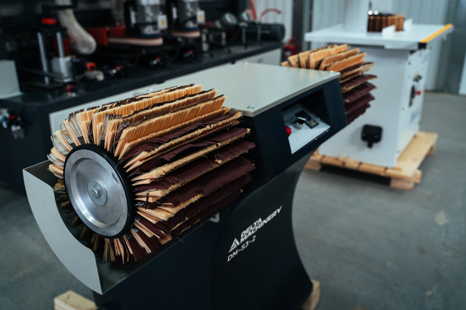 Станок оснащен двумя горизонтальными барабанами. Простая и удобная смена абразивных вкладышей и поддерживающих сизалевых щеток.