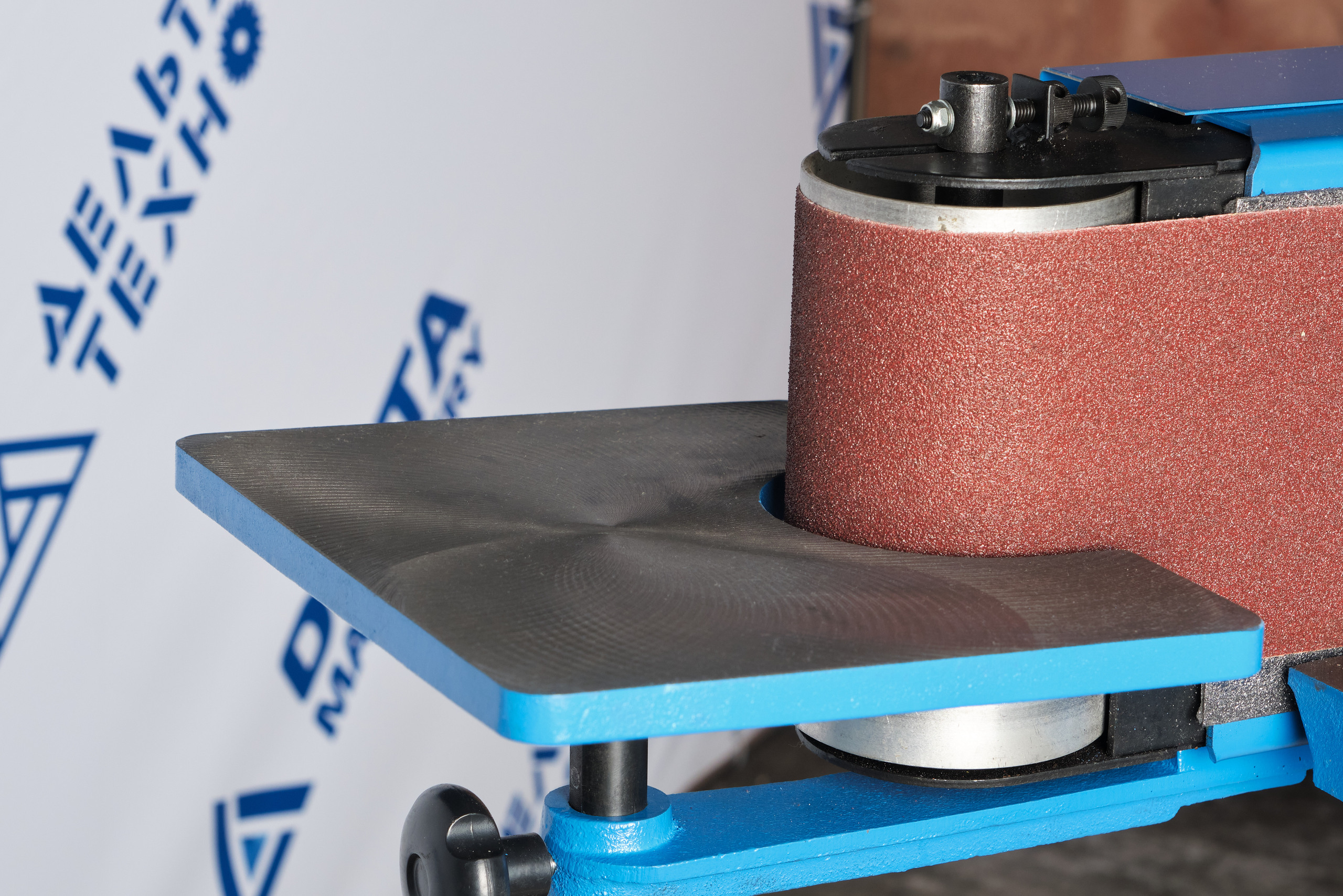 • - Станок оборудован выносным столом, расположенным напротив натяжного ролика ленты. На нём выполняют операции по шлифовке криволинейных кромок