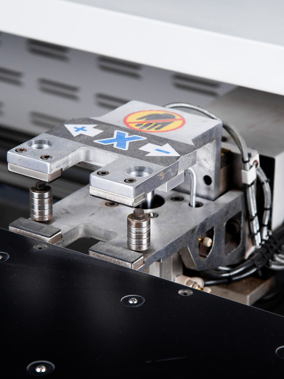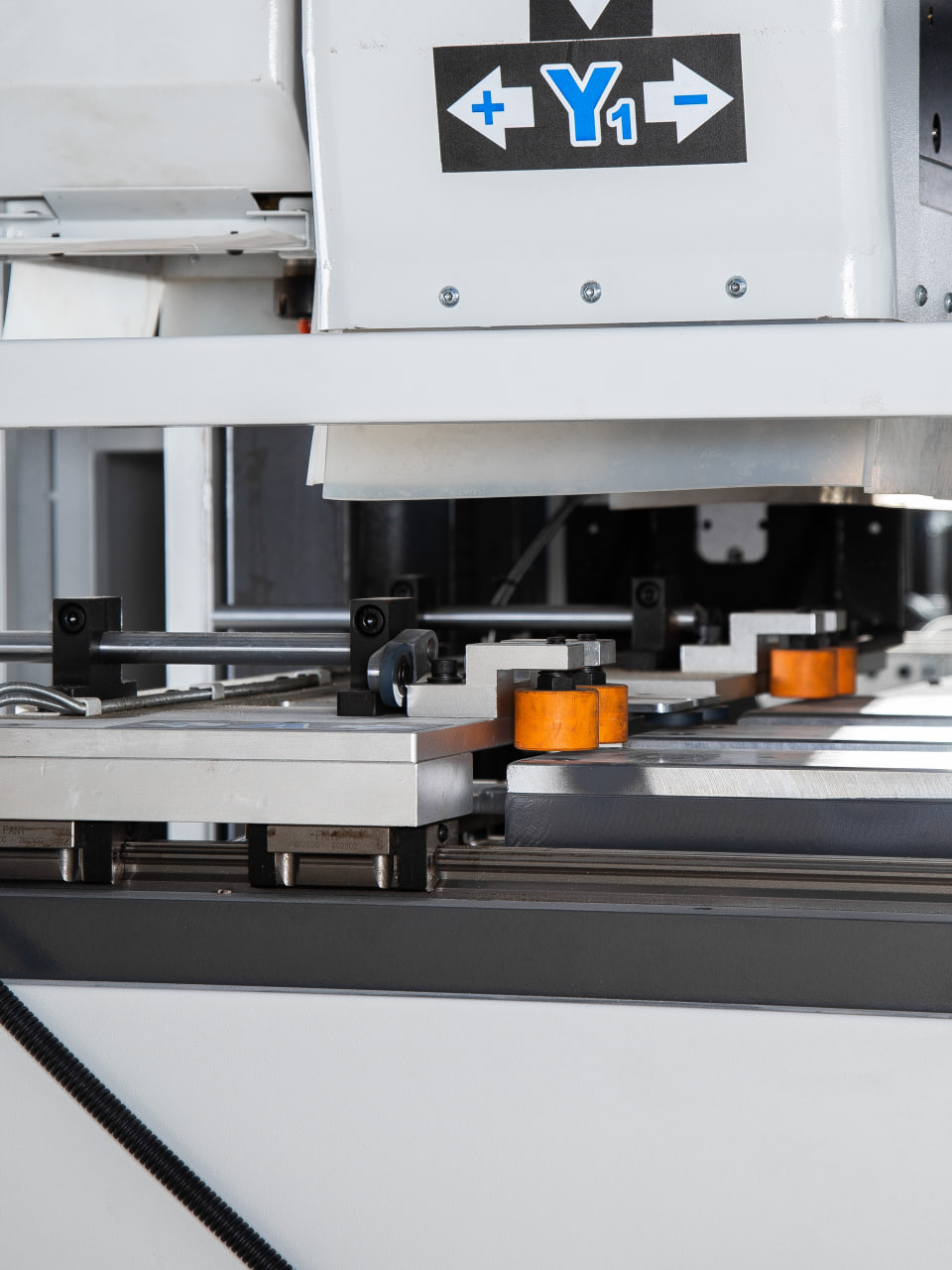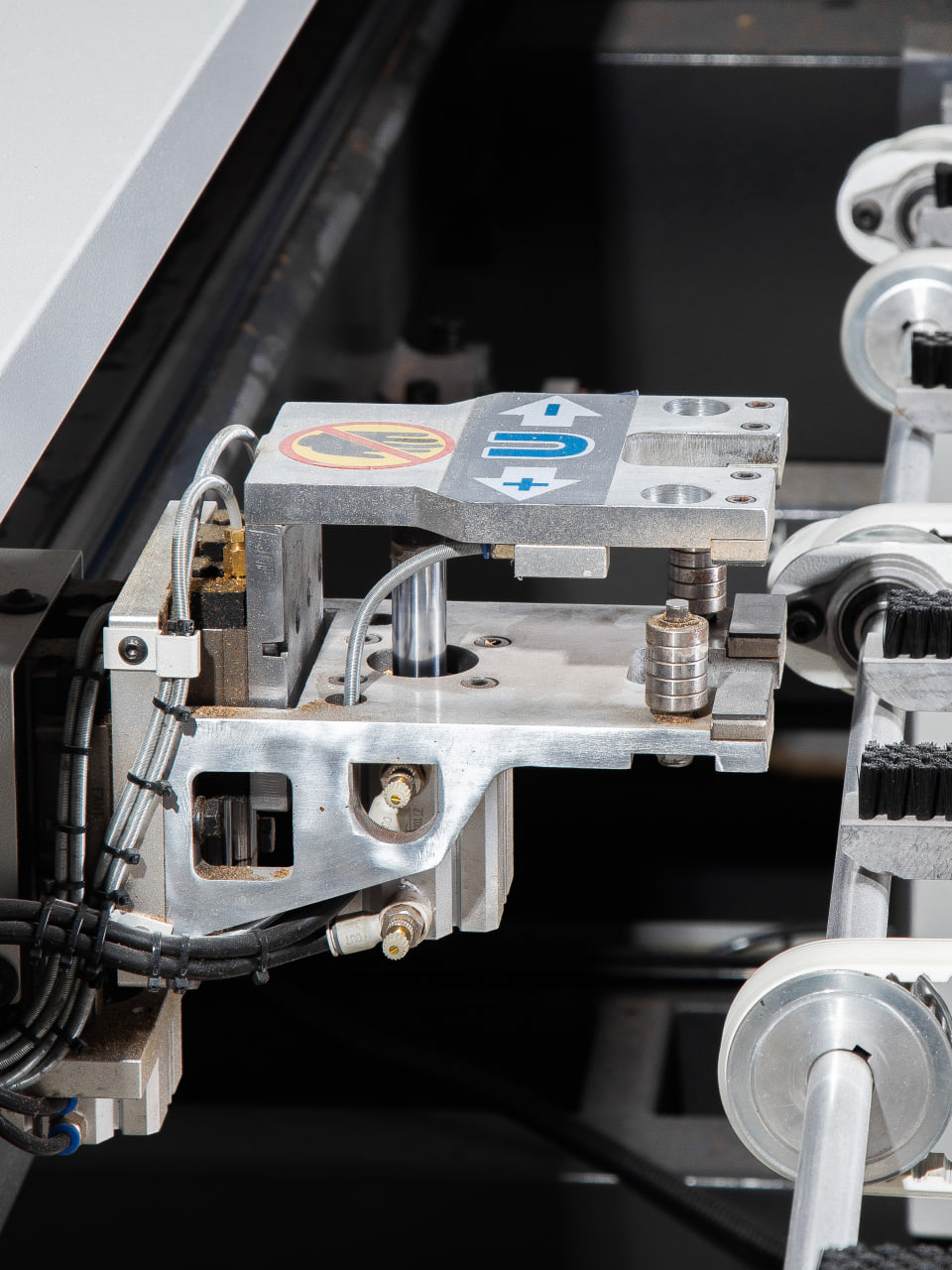Программно-управляемый боковой упор с обрезиненными роликами, для надежного и точного позиционирования детали.