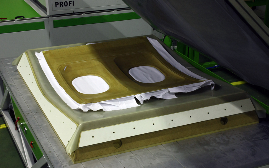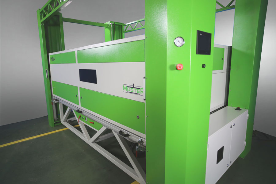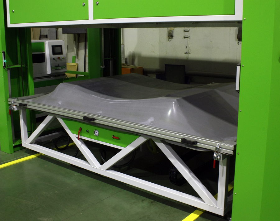 Мембранно-вакуумный пресс Master Composite оборудован выдвижным вакуумным столом 2760х1800 мм и вертикально-подъёмным термокуполом со смотровым стеклом. Система быстрой замены мембраны, автоматический подъём прижимной рамки с силиконовой мембраной, другая полезная автоматика повышает производительность, делает работу более удобной и безопасной. Вакуумный пресс Master Composite комплектуется немецким высокопроизводительным вакуумным масляным пластинчато-роторным насосом Busch R5, производительность 63 м3/ч. Термокупол с ячеистым алюминиевым отражателем и дополнительной термоизоляцией. Количество нагревательных КГТ ламп 68 шт., мощностью по 600 Вт. Вертикальный ход термокупола – 900 мм. Вакуумный стол из алюминиевого сплава толщиной 8 мм. Процесс формования полность автоматизирован.