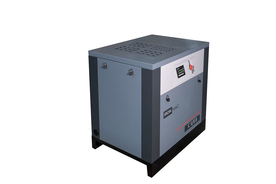 Винтовой компрессор IronMac IC B из основной линейки, собран на прочной стальной раме. Компрессор предназначен для малых и средних предприятий, а все узлы конструкции фиксируются к жесткому основанию и дополнительно изолируются от вибраций. На серии IC B реализована система ременного привода через клиновые ремни, а двигатель имеет уровень защиты от IP 23 до IP 55.