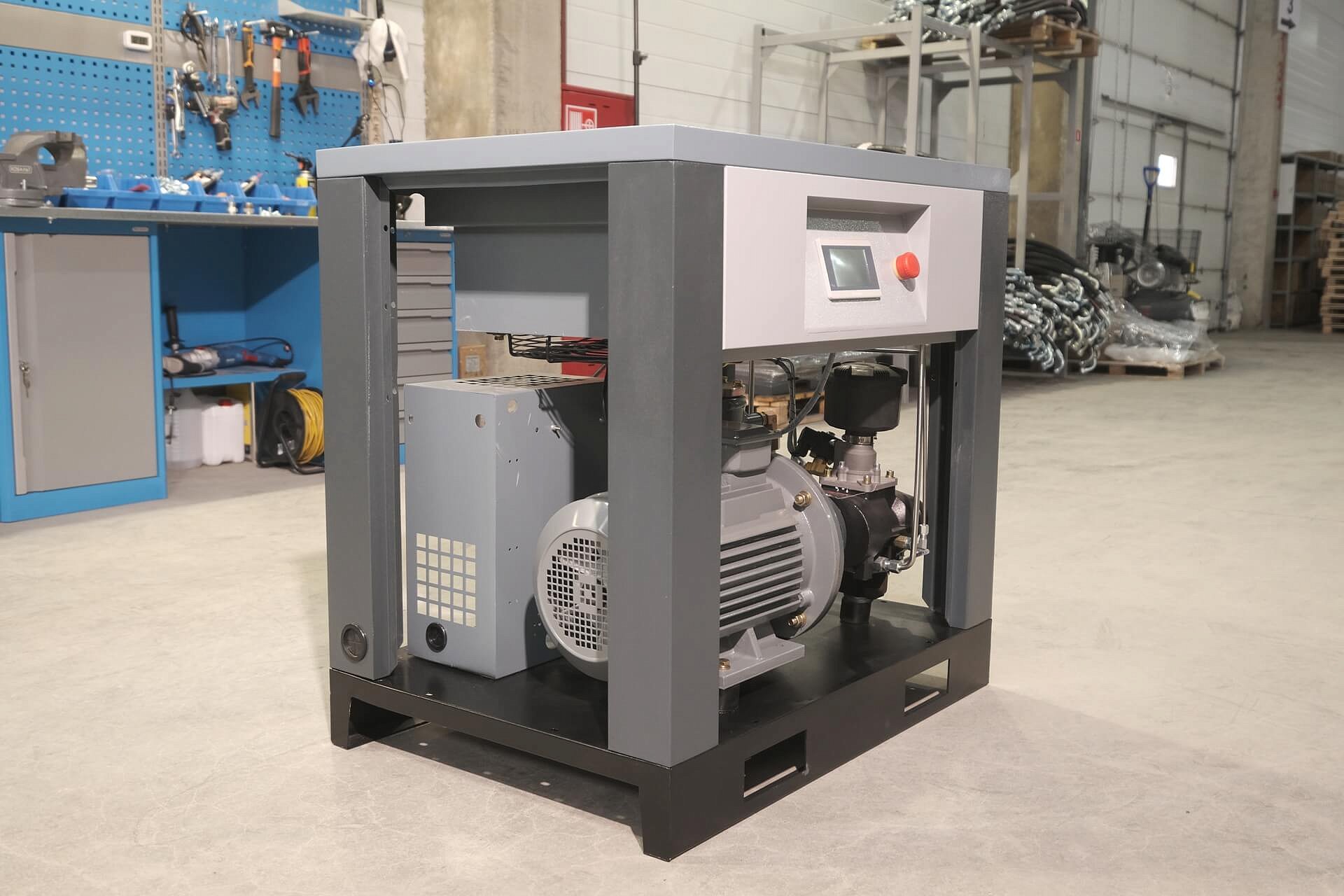 Обеспечивает плавный пуск и остановку компрессора. Так же плавный пуск позволяет снизить пусковые токи двигателя, что помогает не перегружать линию электроснабжения. Так же преобразователь частоты обеспечивают защита компрессора от различных аварийных ситуаций, таких как перегрузка, короткое замыкание, потеря фазы и другие.