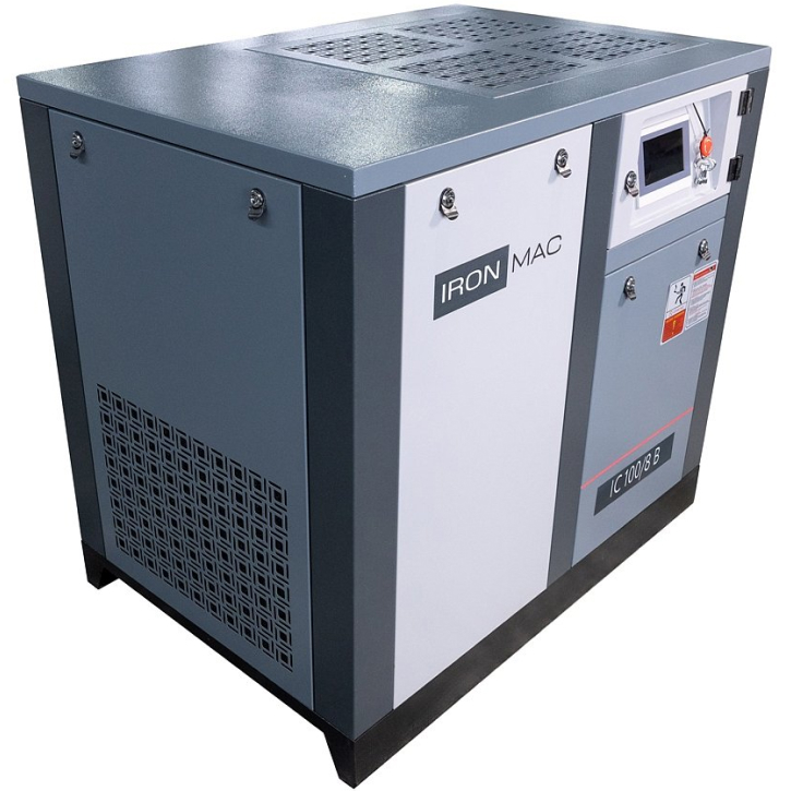 Винтовой компрессор IronMac IC B из основной линейки, собран на прочной стальной раме. Компрессор предназначен для малых и средних предприятий, а все узлы конструкции фиксируются к жесткому основанию и дополнительно изолируются от вибраций. На серии IC B реализована система ременного привода через клиновые ремни, а двигатель имеет уровень защиты от IP 23 до IP 55.