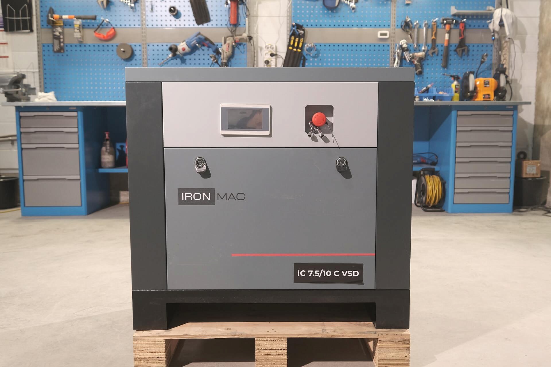 Винтовой компрессор IronMac IC C VSD IP 23 из профессиональной линейки, собран на прочной стальной раме. Компрессор предназначен для малых и средних предприятий, а все узлы конструкции фиксируются к жесткому основанию и дополнительно изолируются от вибраций. На серии C VSD реализована система прямого привода, а двигатель имеет уровень защиты по классу IP 23 с высокой степенью эффективности отведения тепла.
